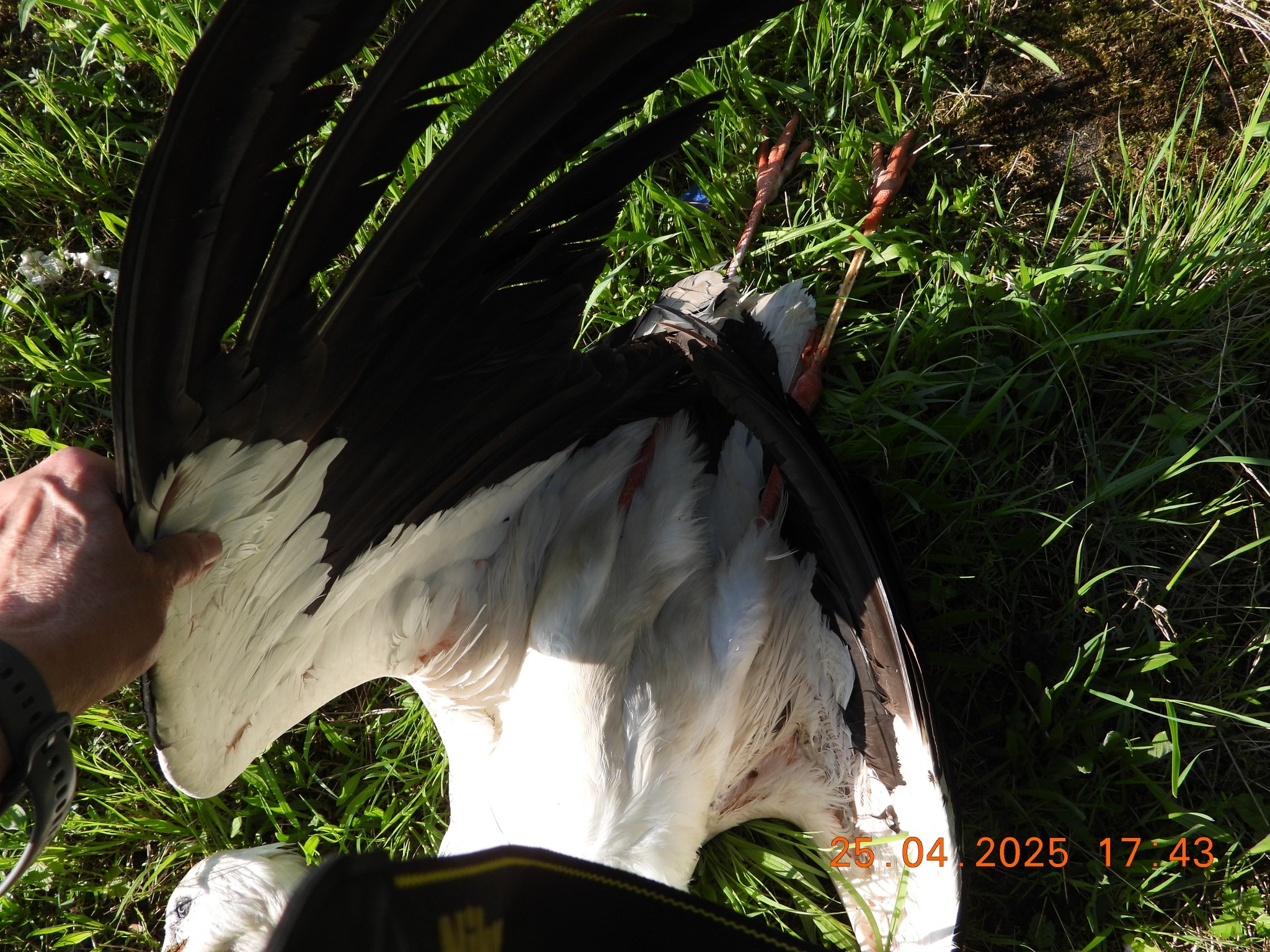 So dauerte es auch nicht lange bis ich einen der Brutstörche am Nachbarmast tot bergen musste. Das Paar hatte gerade mit der Brut begonnen