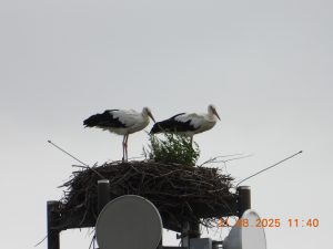 Erstbruten sind oft erfolglos, Storchenkämpfe zwischen den ansässigen Kolonienstörchen waren an der Tagesordnung. Ganz besonders mit den Störchen der kath. Kirche, aber auch mit dem Horstpaar des Spänebunkers Blecher gab es oft Auseinandersetzungen. Unter dem Horst wurden aber auch im zweiten Jahr, 2024, 2 tote Küken gefunden und 2025 gab es einen Totalverlust, wie in vielen Horsten hessenweit. Es kann also nur besser werden…