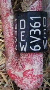 Die Störche in Hessen werden mit ELSA Ringen beringt. Der ELSA Ring ist ein Kunststoffring, der aus zwei Teilen besteht, die bei der Beringung fest ineinander gedrückt werden und dann miteinander verbunden sind. Auf dem Ring steht ein aus Zahlen und Ziffern zusammengesetzter Code, über ihn wird der Storch später identifiziert, es ist sein Personalausweis. Auch der Name der Vogelwartewarte ist angegeben, diese Angaben wiederholen sich auf dem Ring in senkrechter Anordnung. Darüber hinaus ist für die Finder der Ringe auch eine Mailadresse angegeben.